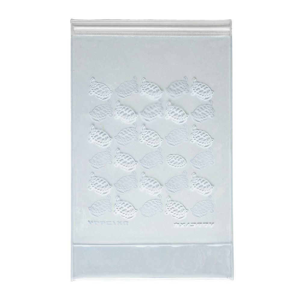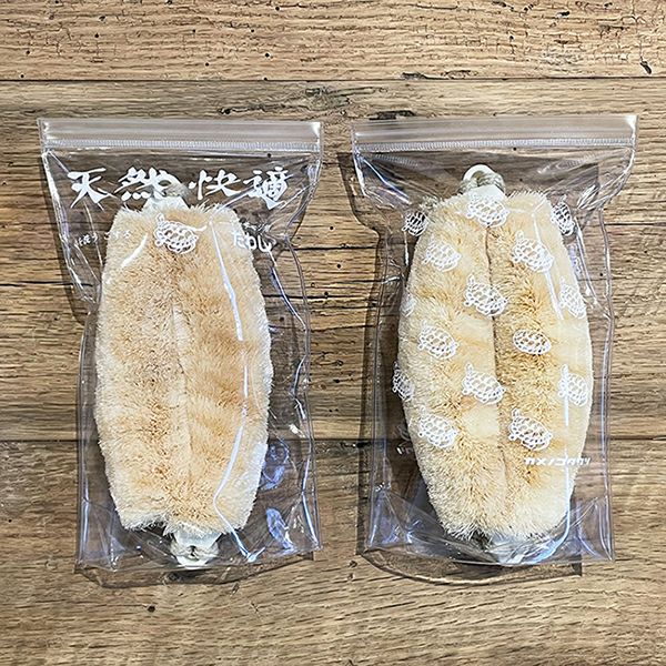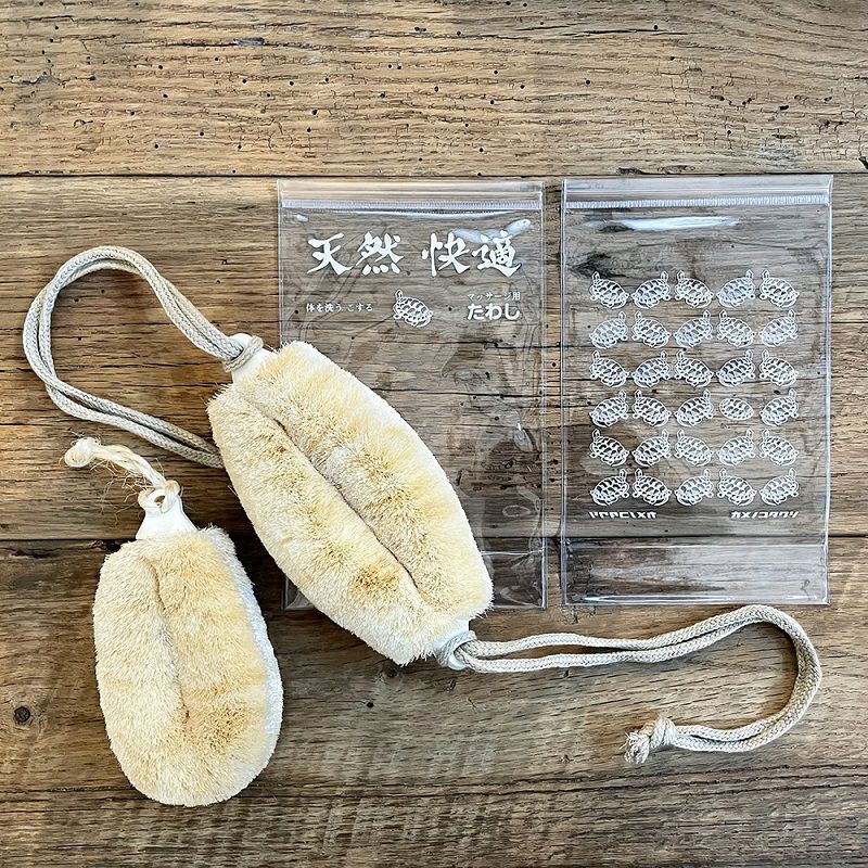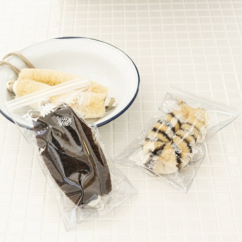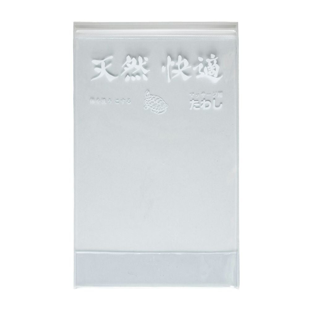 トップ部は押して閉めるタイプのテンチャック使用。あえてスライダーを付けないことで水漏れを防ぎます。 プリントデザインはトートバッグで人気の「亀たくさん」と健康たわしのパッケージをイメージした「天然快適」の2種類をご用意しています。 健康たわしを持ってお気に入りの温浴施設へお出かけください。