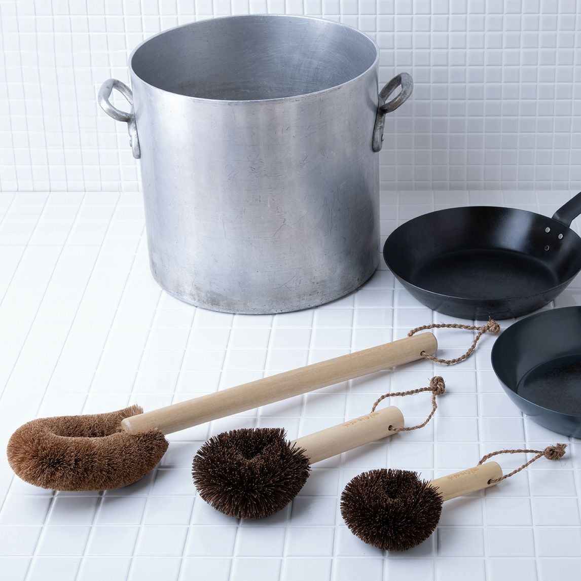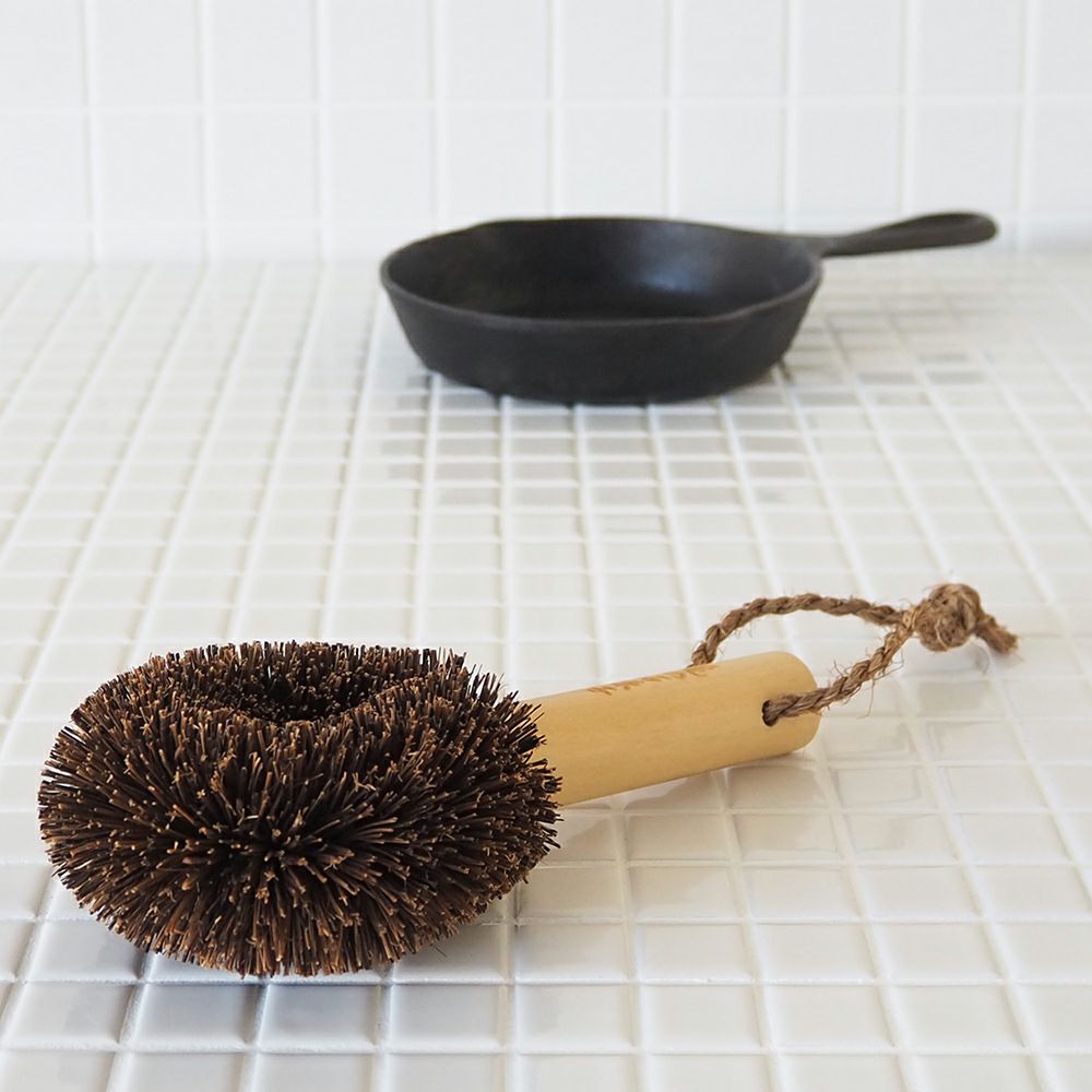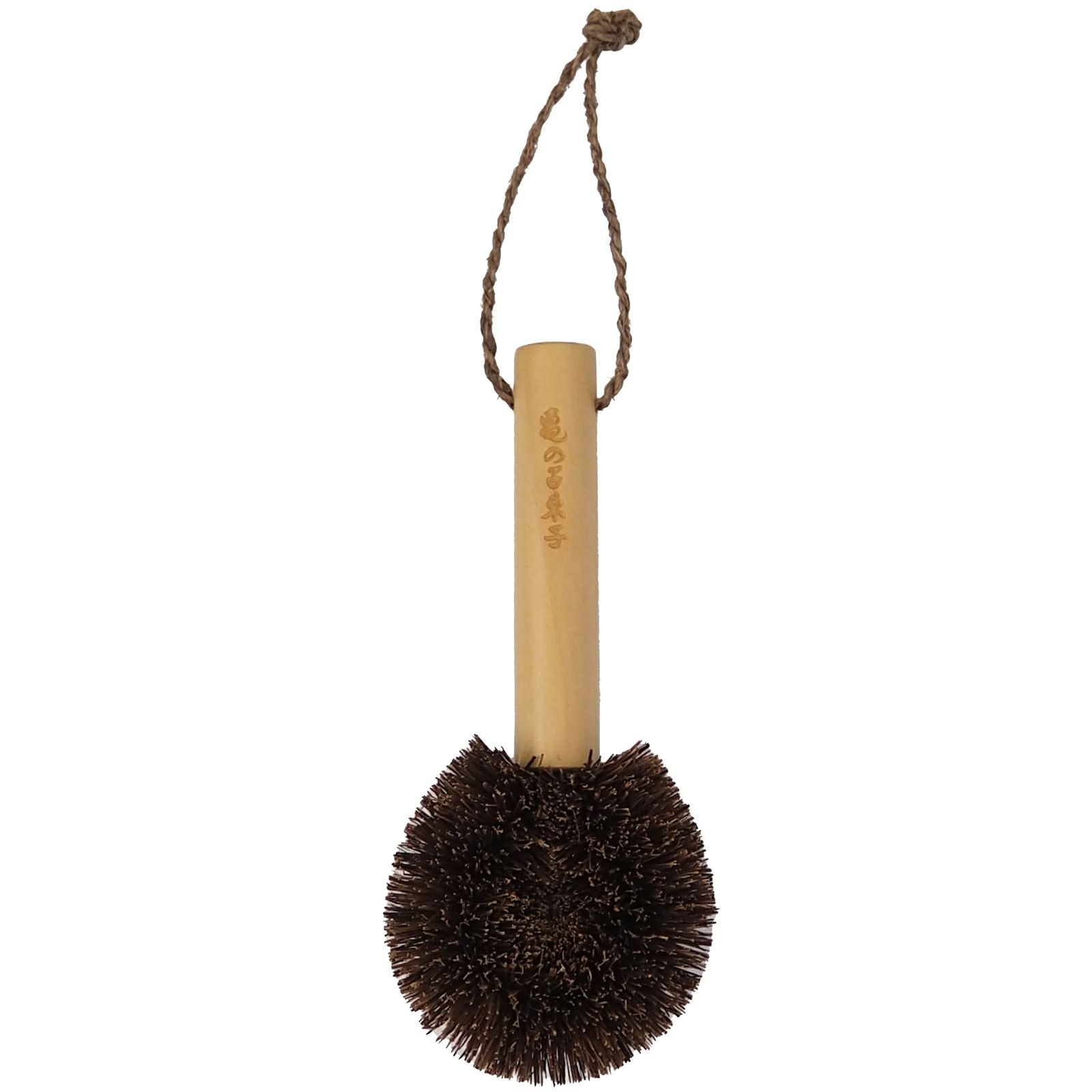 パルミラヤシの葉柄の繊維を使用した柄付きたわし。パルミラヤシの葉柄は繊維が太く硬いため、鉄のフライパン・中華鍋・スキレット・グリル鍋など鉄器に付いた頑固な焦げ付きやこびり付きを落とすことに適しています。