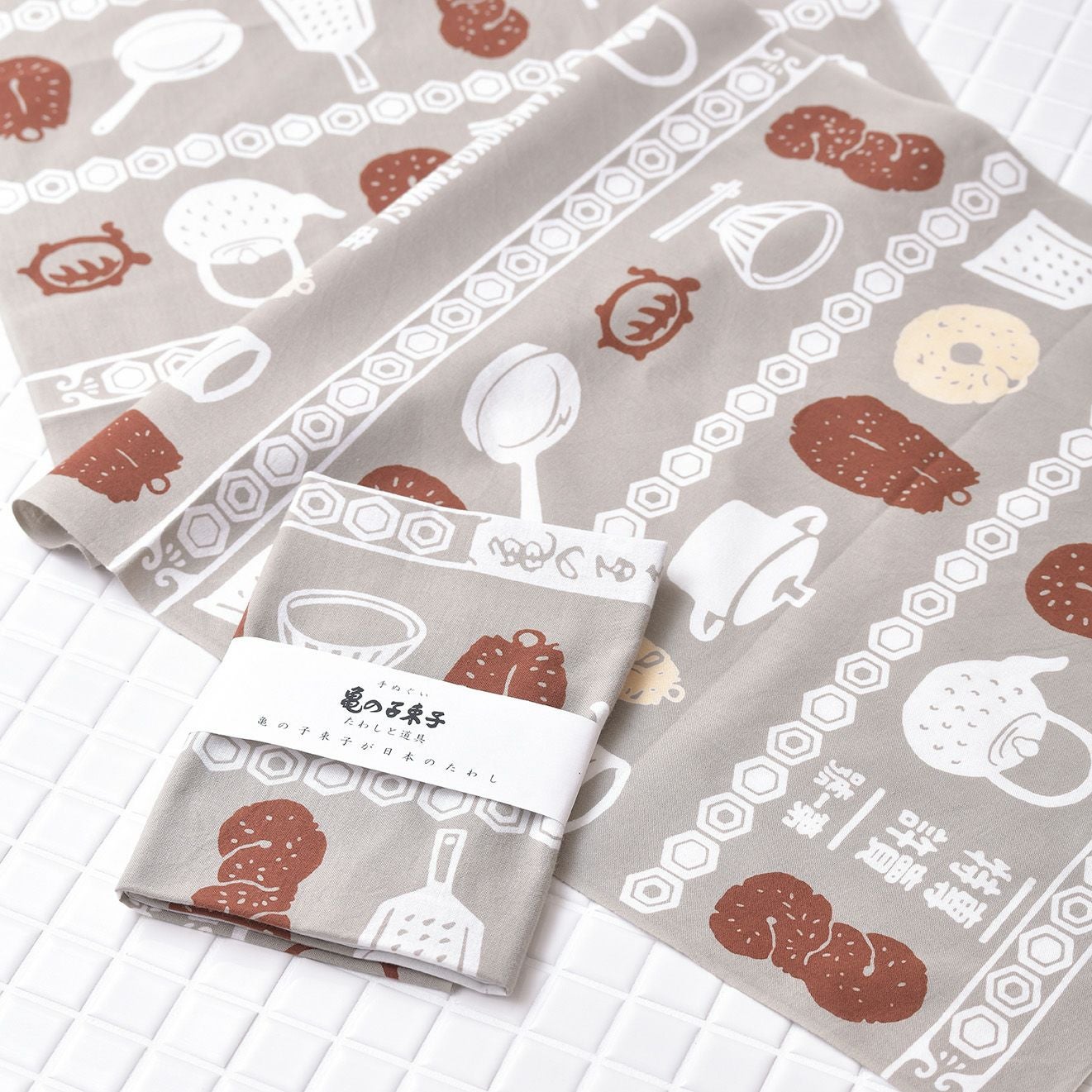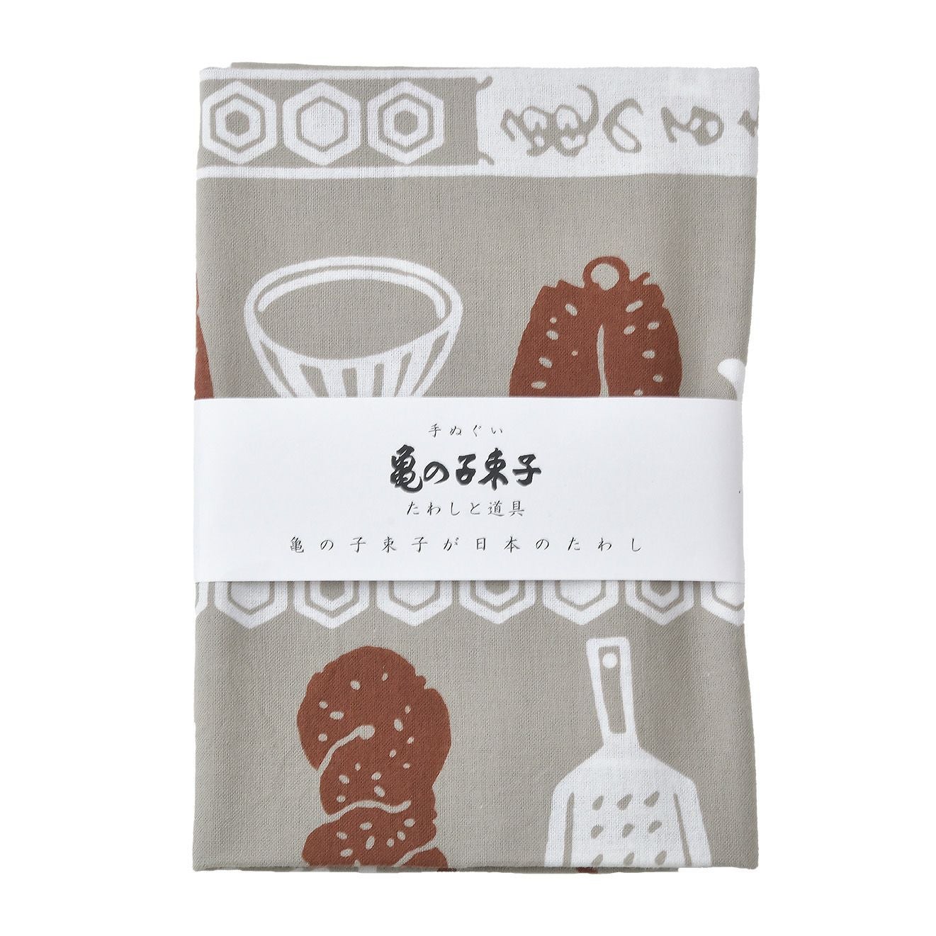 新柄として登場した、たわしと道具をモチーフにしたグレーの手ぬぐいです。