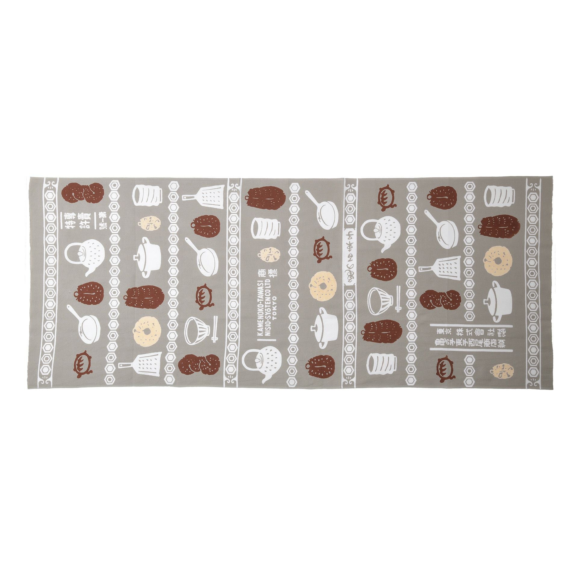様々な形のたわしと台所用品として活躍する道具が描かれた、亀の子束子ならではの一枚です。