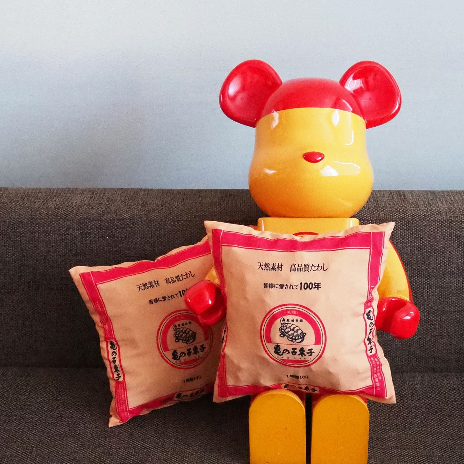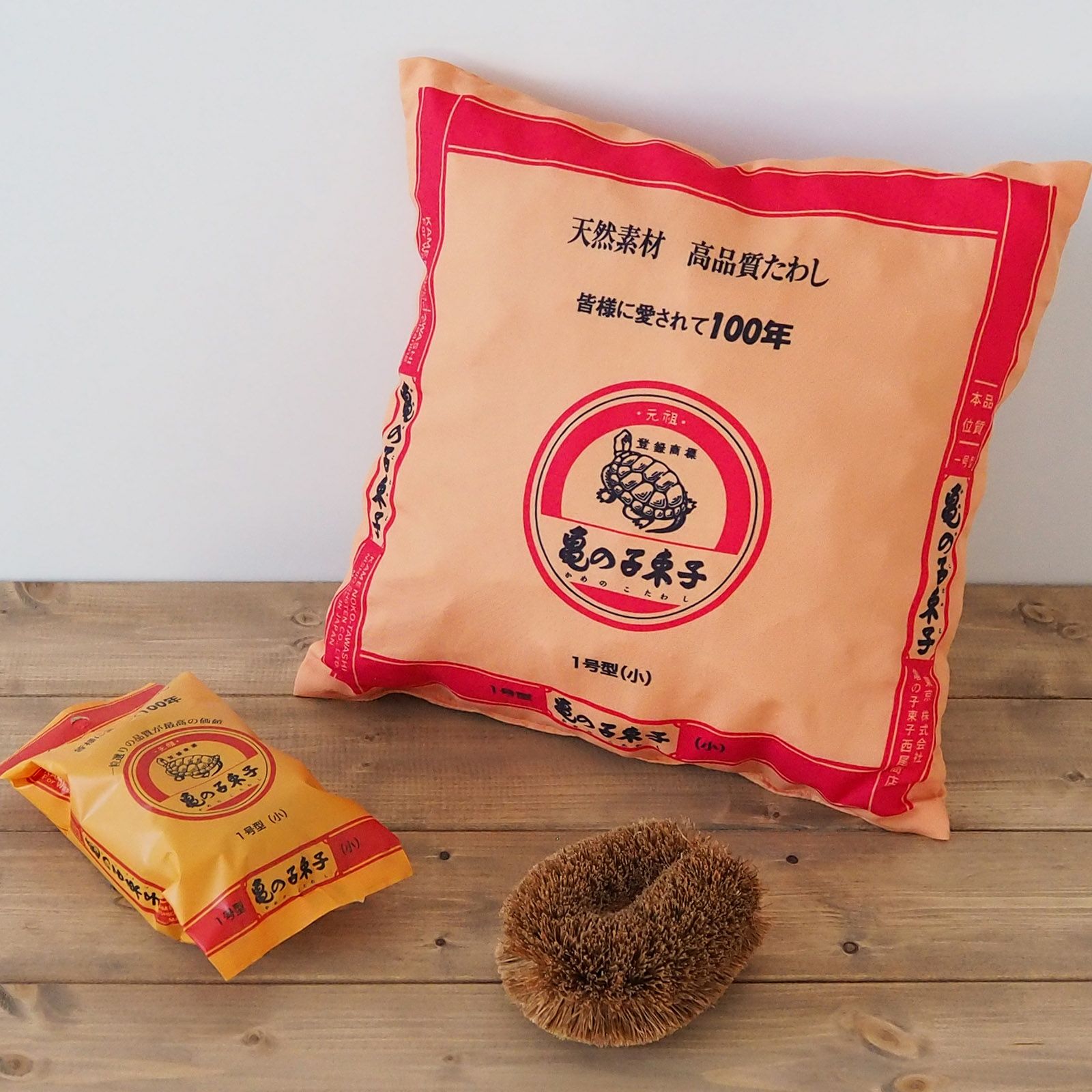 カバーには亀の子束子のパッケージデザインを採用。亀の子ファンへの感謝の気持ちを込めた遊び心のあるクッションです。