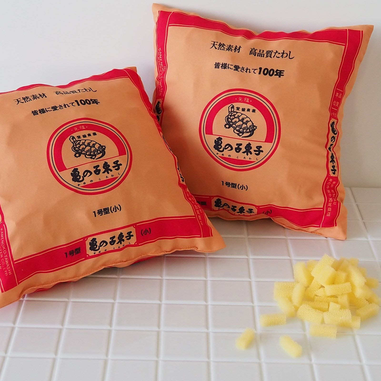 このクッションは、亀の子スポンジの端材を中材に使用した環境配慮商品です。