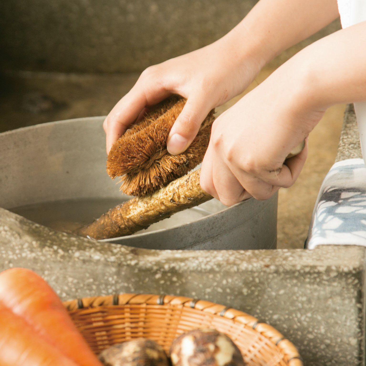 手に握りやすいサイズを熟考して開発された1号型は、創業来伝統の逸品です。長年愛される理由は、厳選されたパーム(ココナッツ繊維)を惜しみなく使った確かな品質。根菜類の泥落としや薄皮むきをはじめ、鉄のフライパン、ザルなどの調理器具を洗うのに適しています。