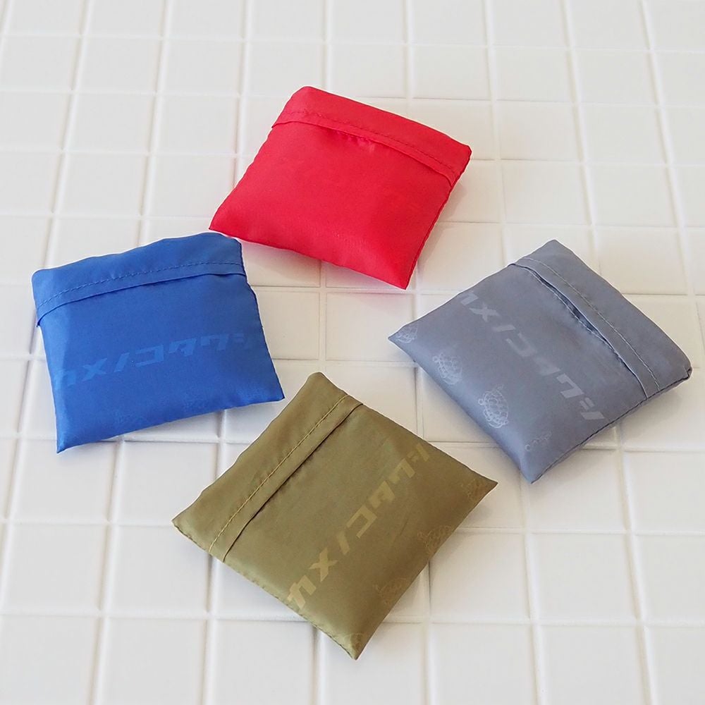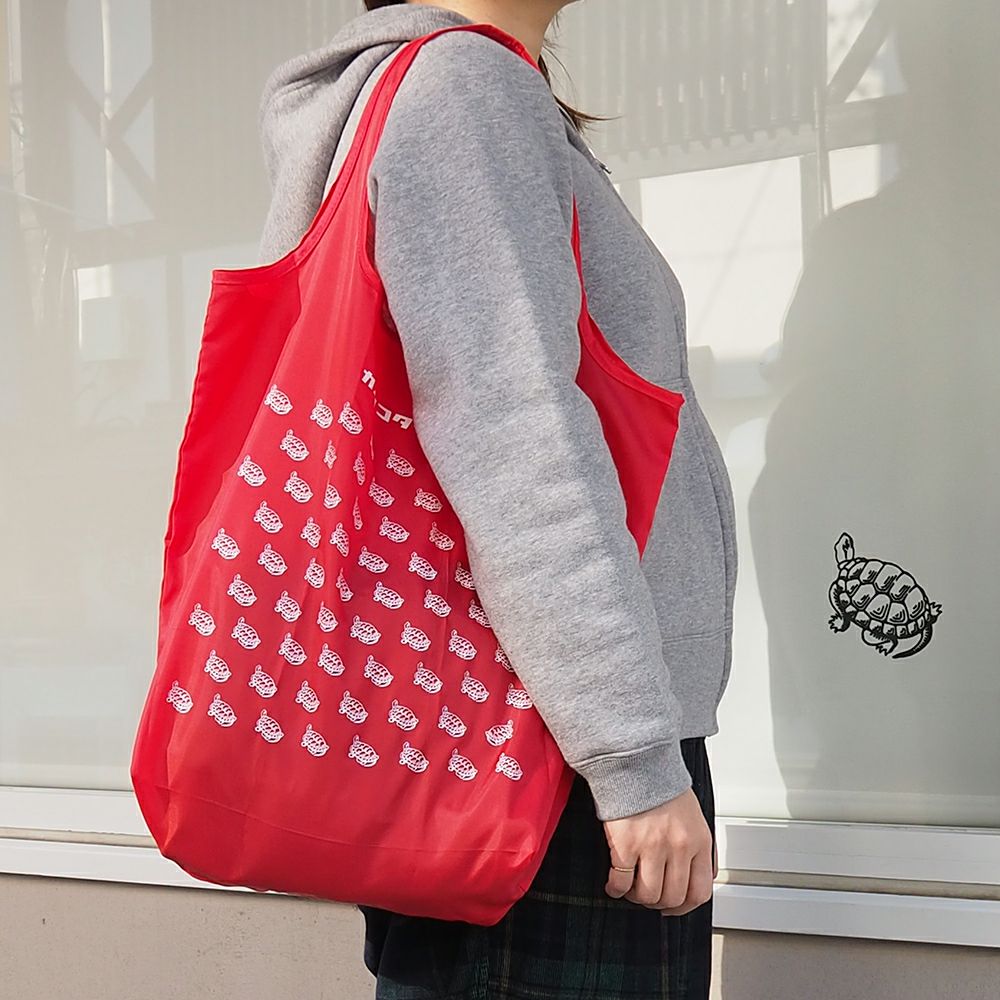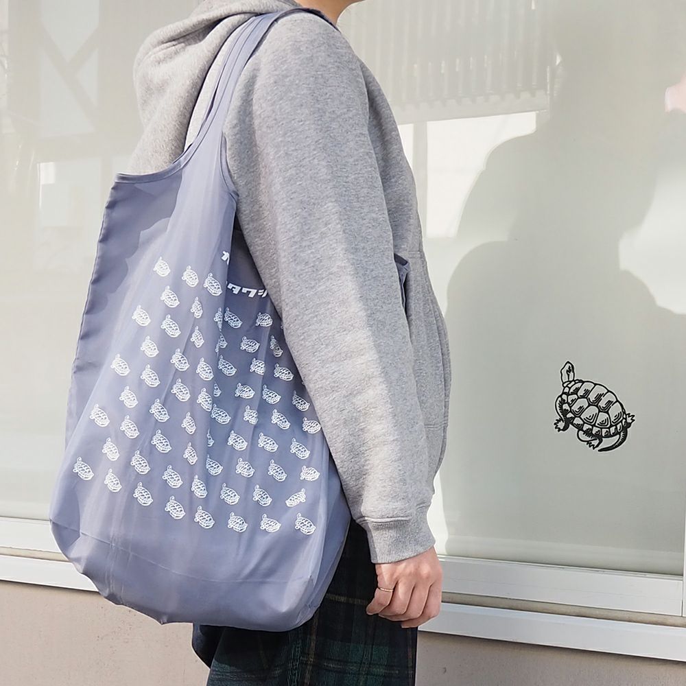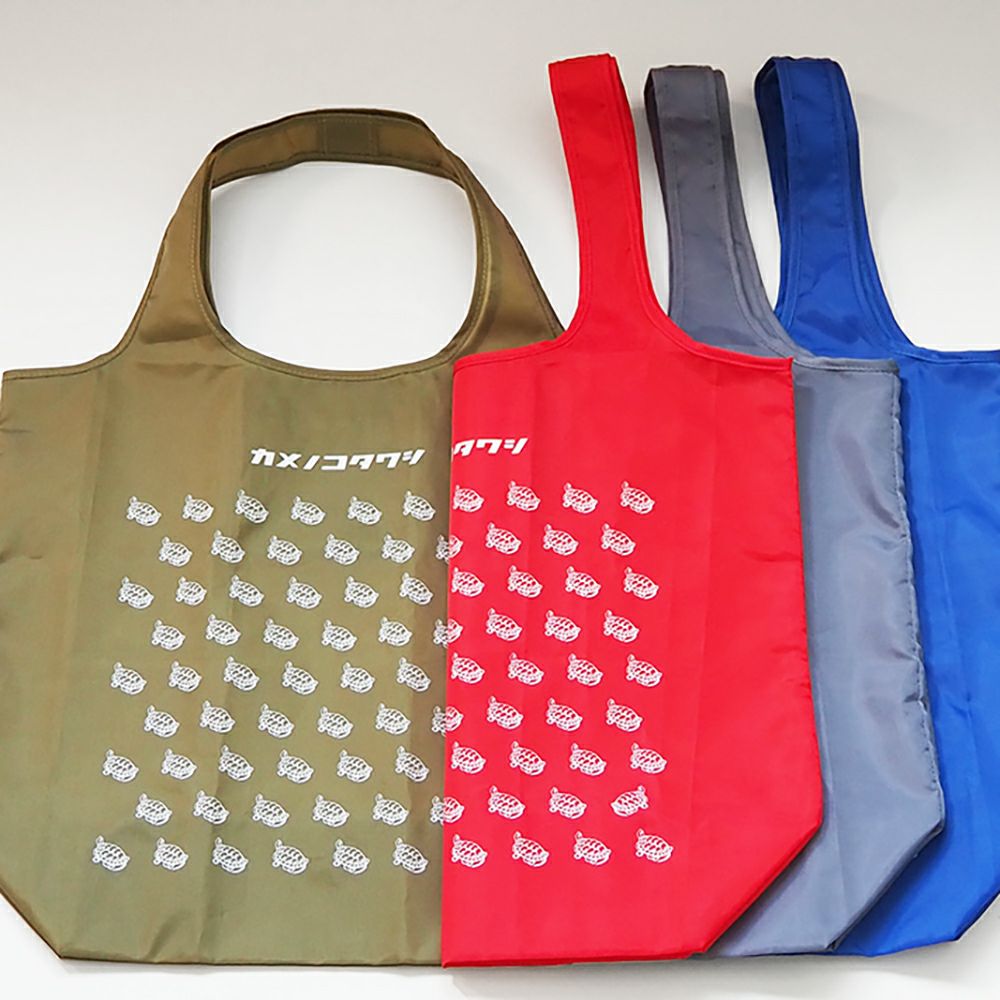 肩にかけられるハンドル、折りたたむと内ポケットに格納できる仕様、汚れが目立たないカラー展開、そして、ファンの多い亀がたくさん並んだ柄の中には一匹だけ違う方向を向いた亀がいます。