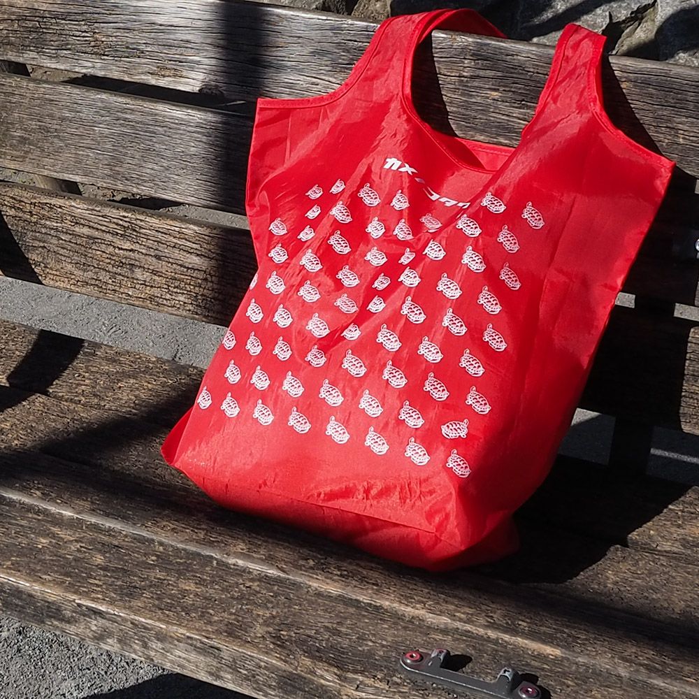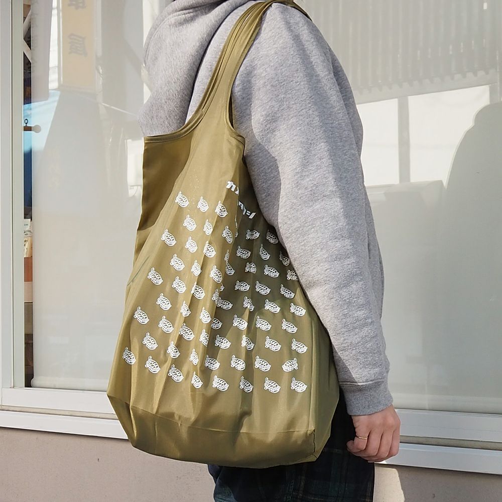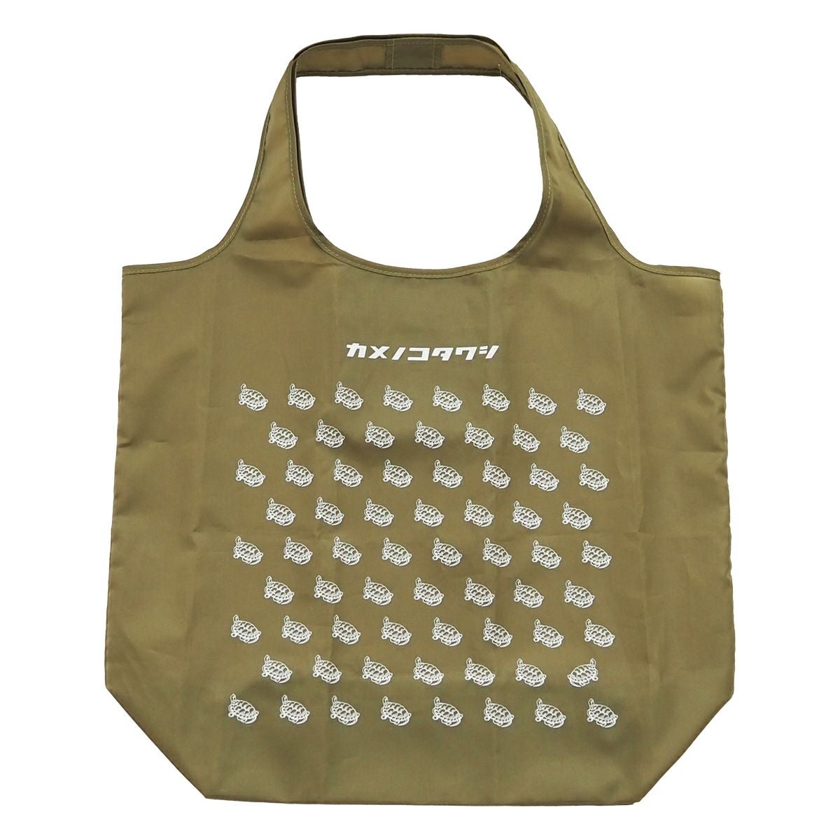 肩にかけられるハンドル、折りたたむと内ポケットに格納できる仕様、汚れが目立たないカラー展開、そして、ファンの多い亀がたくさん並んだ柄の中には一匹だけ違う方向を向いた亀がいます。