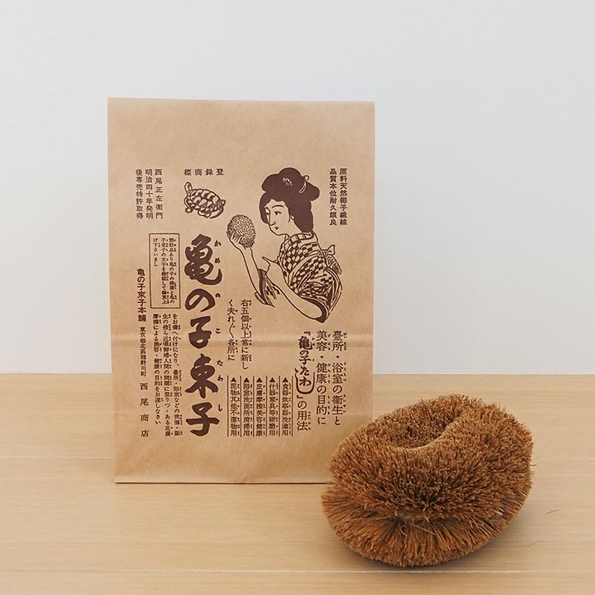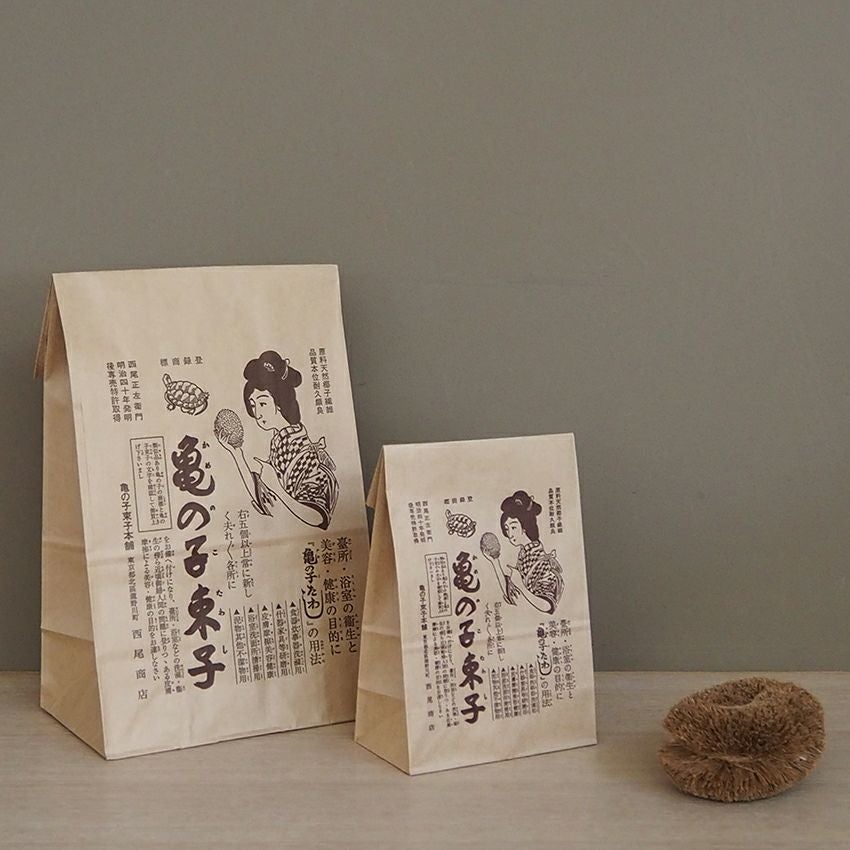 亀の子束子の昔の広告をアレンジしたデザインのレトロ袋。イラストも文字も昔のままに見えますが、文章は現代の要素を加えていますので、読む楽しみもあります。大きさは、小と大と手提げの3種類をご用意しました。ギフト用にもご利用頂けます。