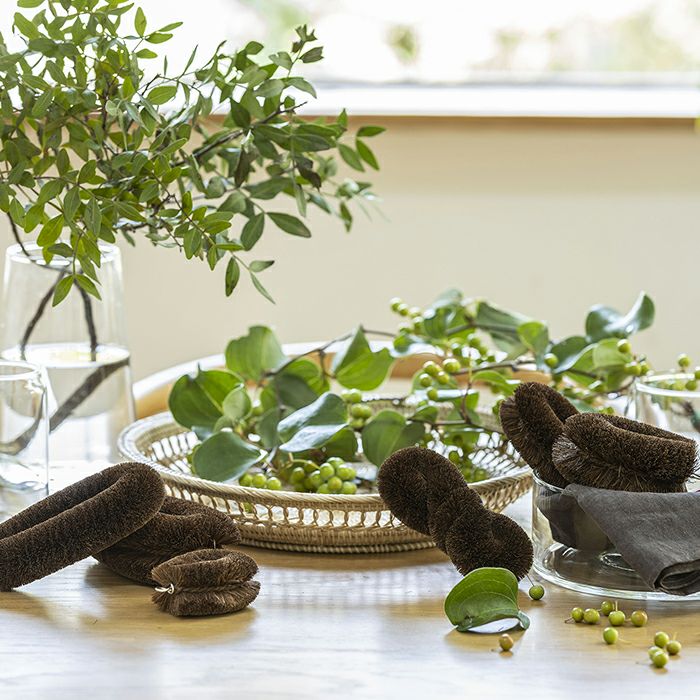 繊維がしなやかで細い棕櫚(シュロ)を使ったたわしは、ガラスや陶器の洗浄にも使え、茶渋落としなどに最適です。ユニークな形は、湯呑やマグカップ洗いにとても便利です。